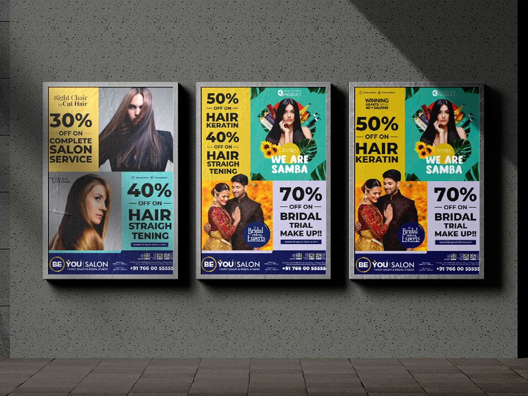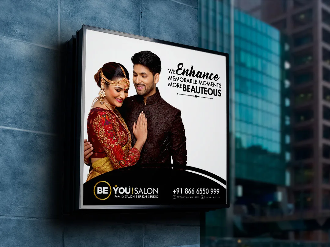 We crafted eye-catching outdoor hoardings designed to drive footfall and elevate Be You Salon’s brand visibility, ensuring a strong, memorable presence in high-traffic areas.