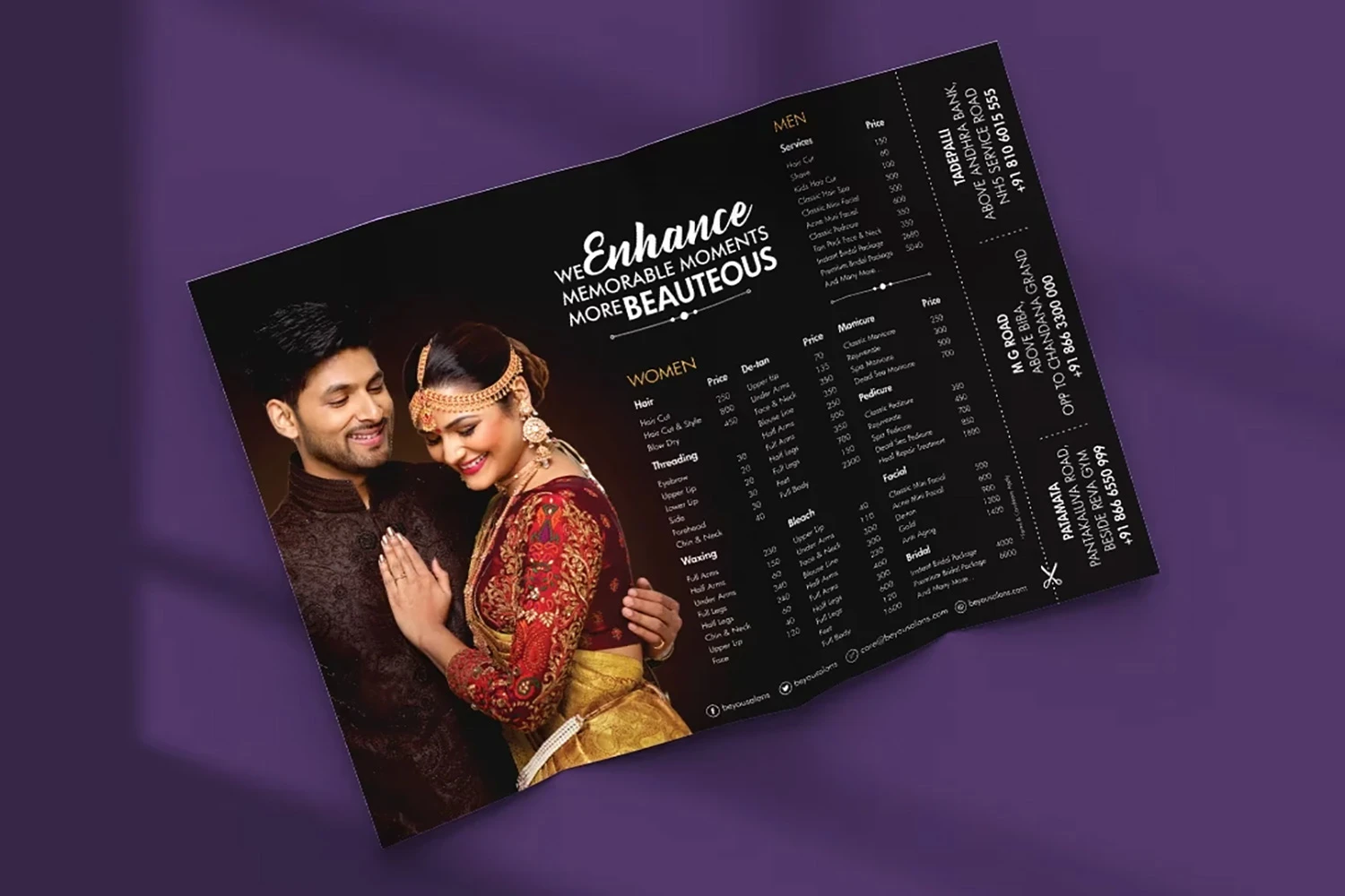 We designed elegant, easy-to-navigate menu cards that reflect Be You Salon’s premium offerings, ensuring a seamless and luxurious experience for clients while showcasing the full range of services in a visually appealing format.